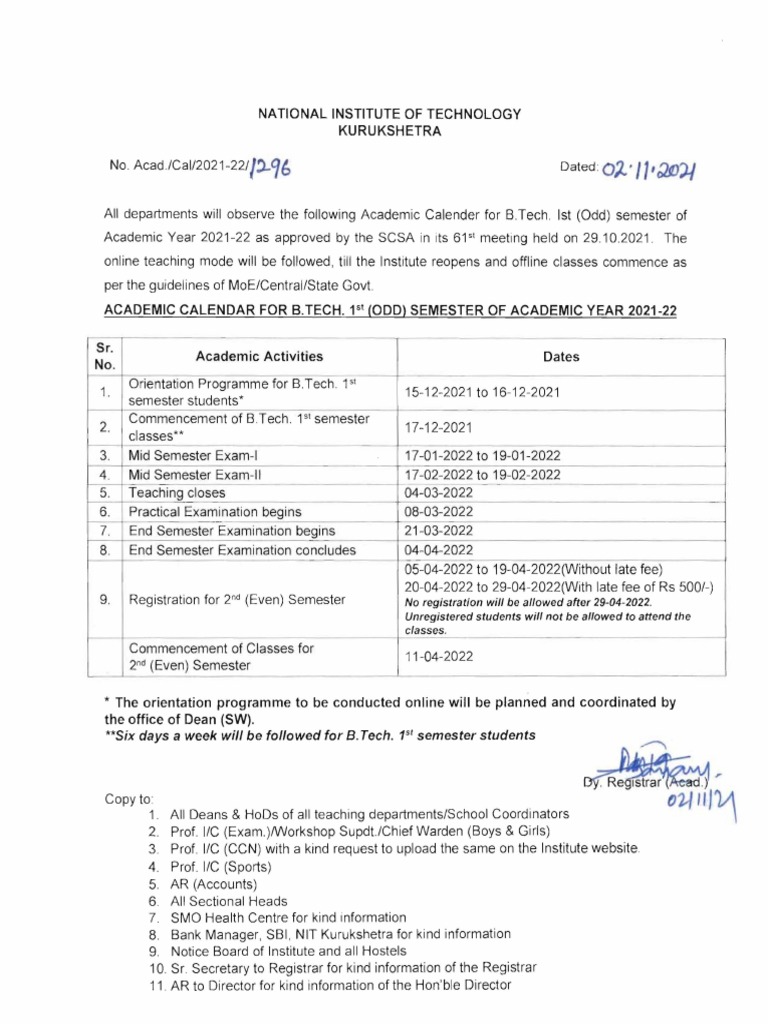 Academic Calendar For B Tech 1st (Odd) Semester of AY 2021 22 02112021