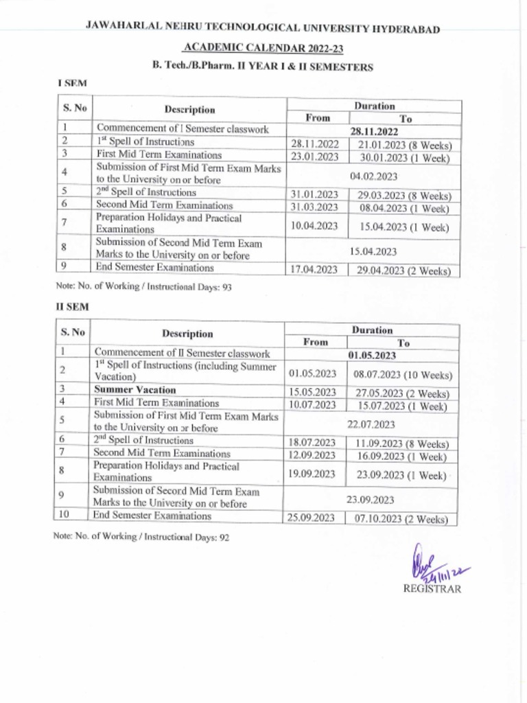 Academic Calendar For B Tech B Pharm II Year I II Semesters 1 PDF