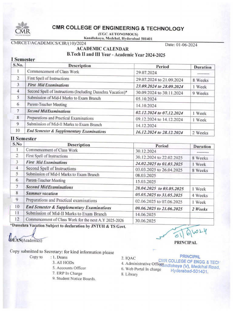 B tech II III Year Acadeic Calendar 2024 25 PDF