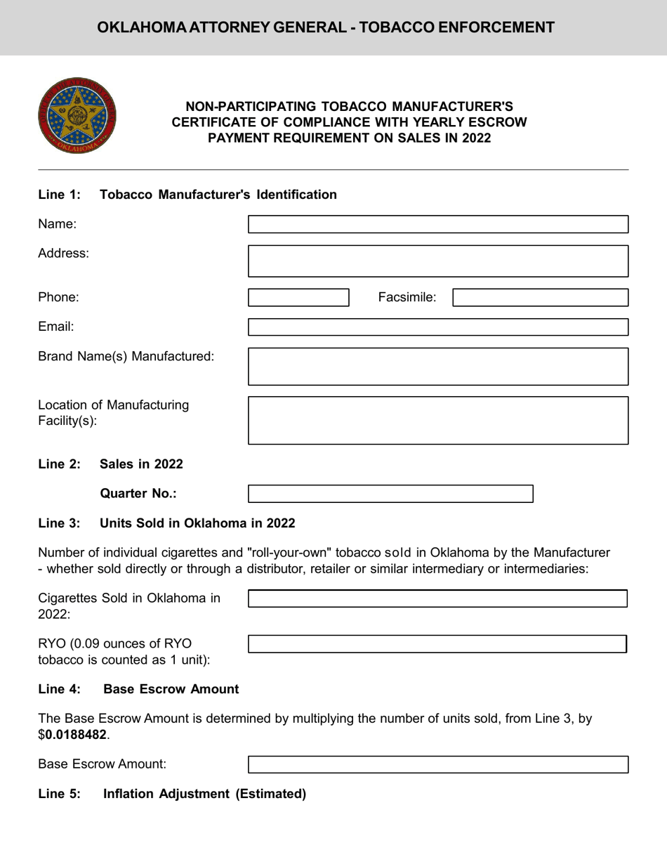2022 Oklahoma Non participating Tobacco Manufacturer #39 s Certificate of