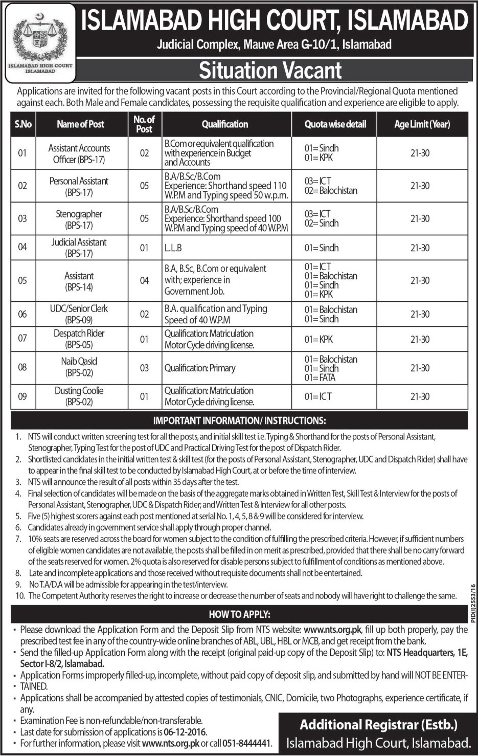 Islamabad High Court Jobs 2014 September Data Entry Operators Others