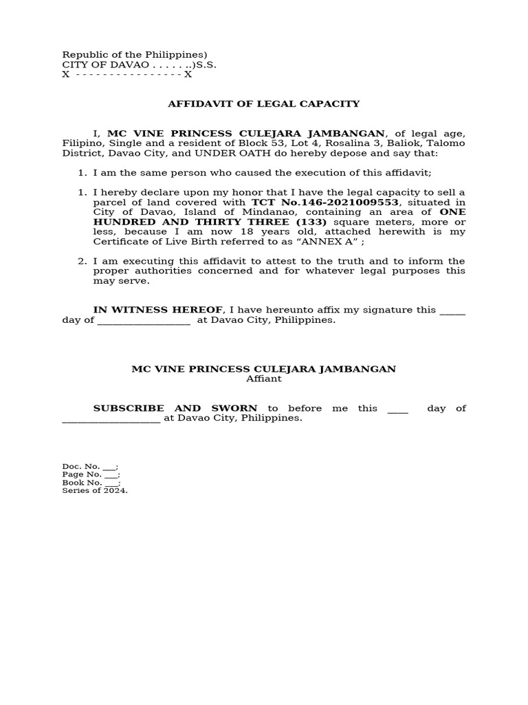 PH Affidavit in Lieu of Certificate of Legal Capacity to Contract