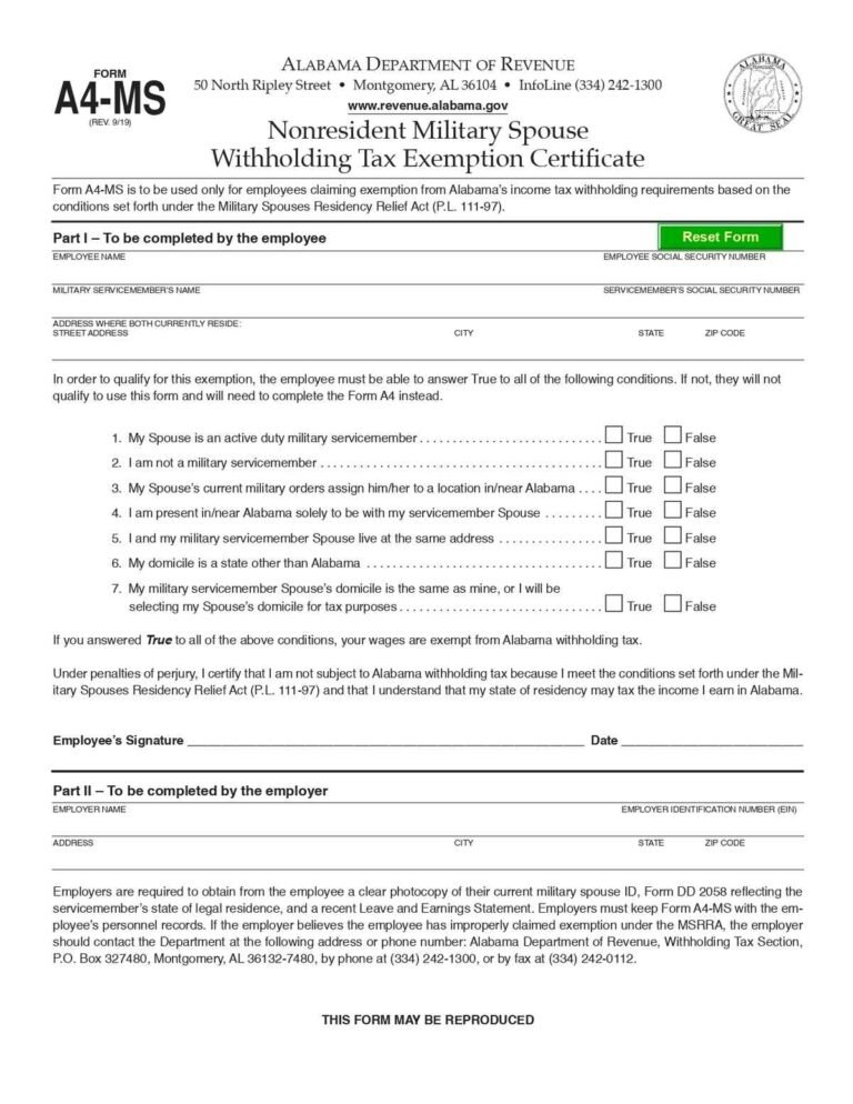 Alabama Military Spouse A4 MS Form Download in PDF