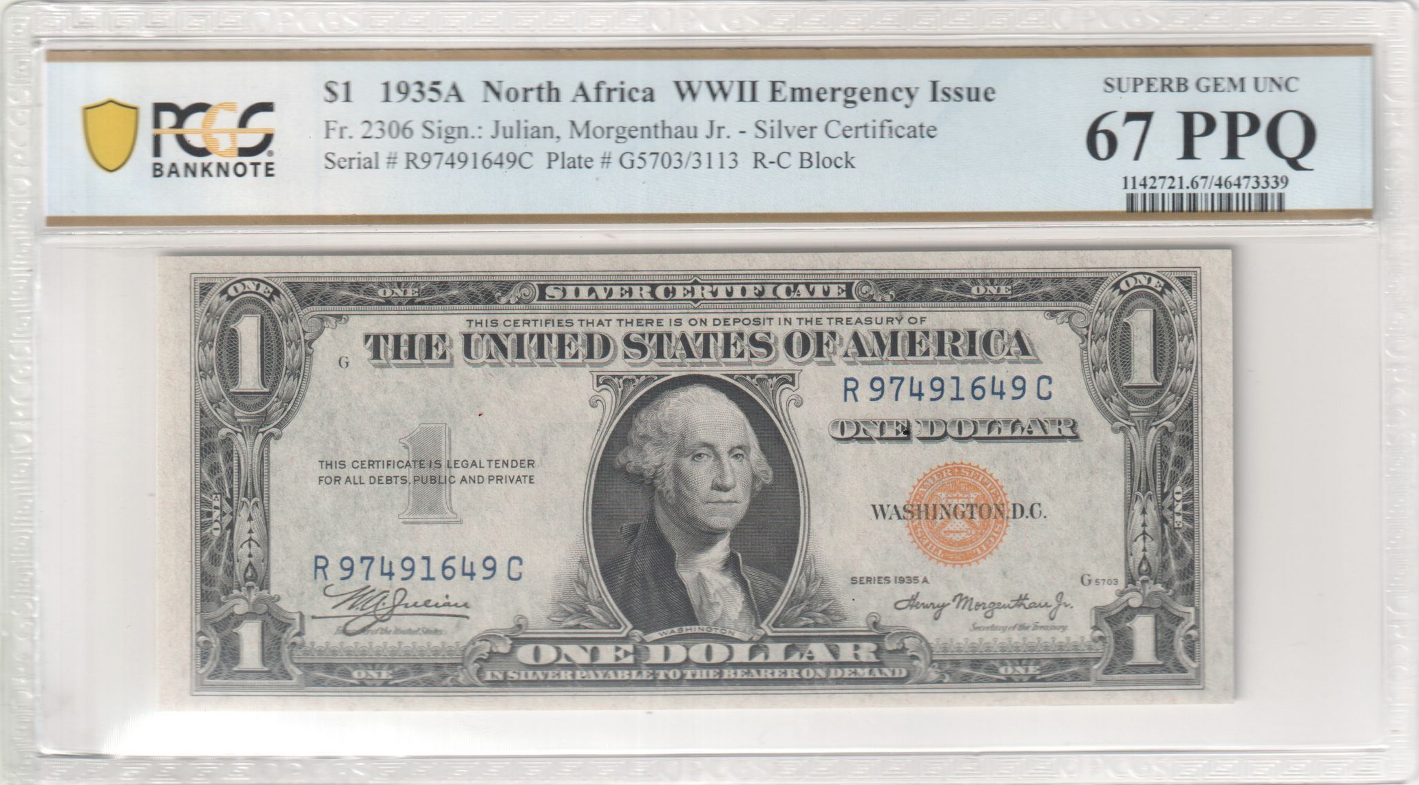 Gem Uncirculated 67 1935 A $1 North Africa Silver Certificate US