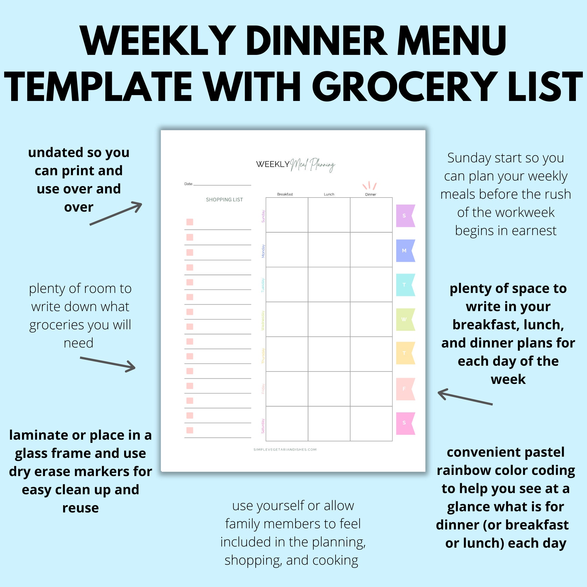 Weekly Dinner Menu Template With Grocery List Printable PDF Rainbow