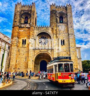 Number 28 tram passing the cathedral in Lisbon Portugal Stock Photo Alamy