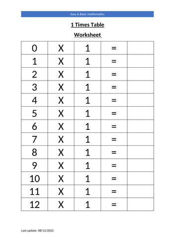 1 Times Tables Worksheets and Tables Free Downloads Multiplication