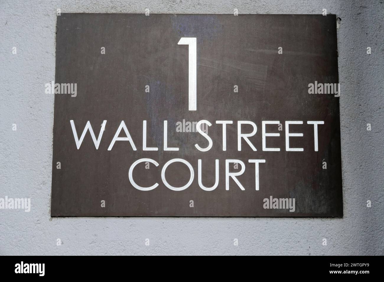 Sign of #39 1 Wall Street Court #39 attached to a stone wall Manhattan New
