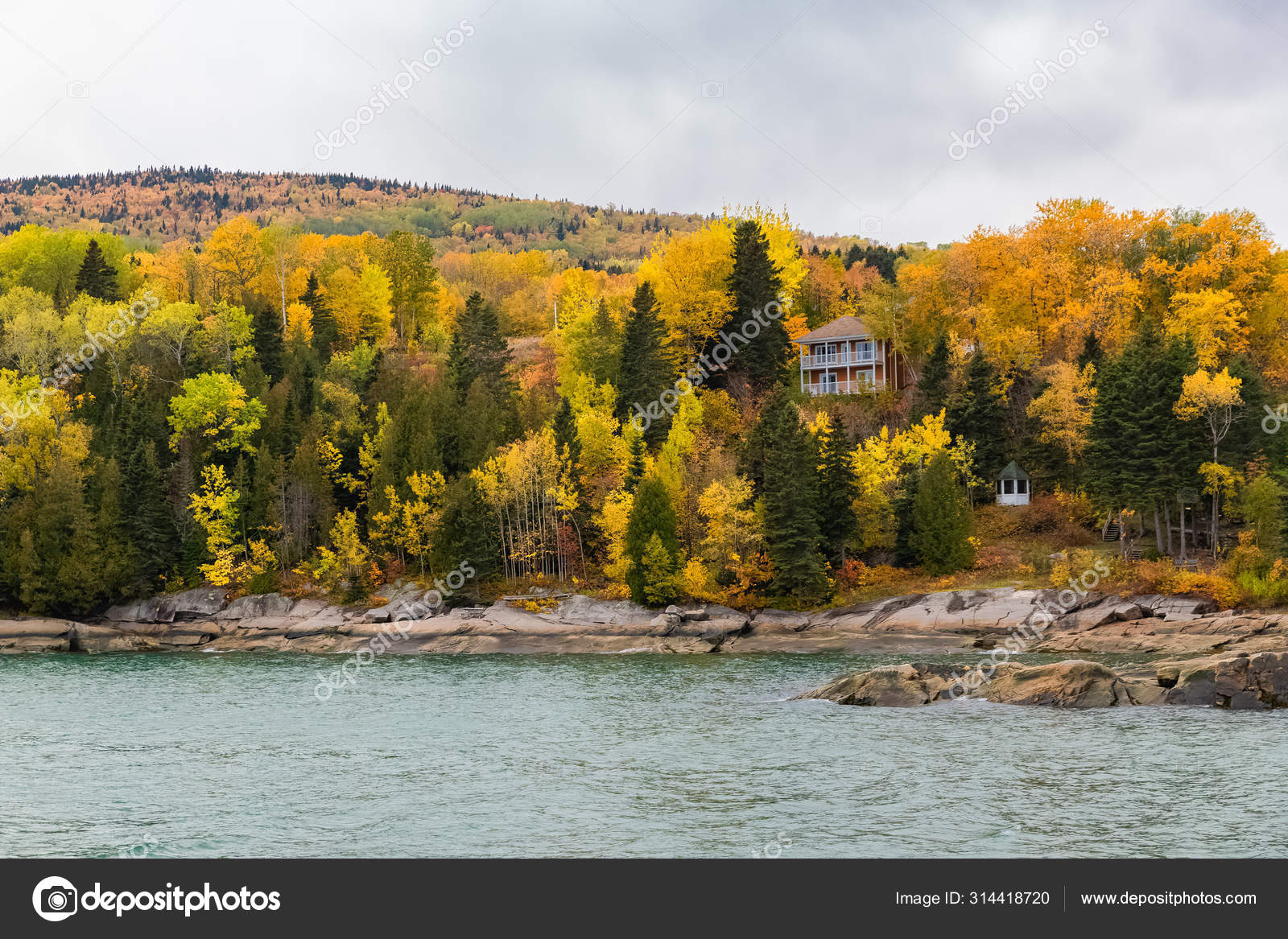 Casa Bosque Lago Canadá Otoño Hermosos Colores Los Árboles: fotografía