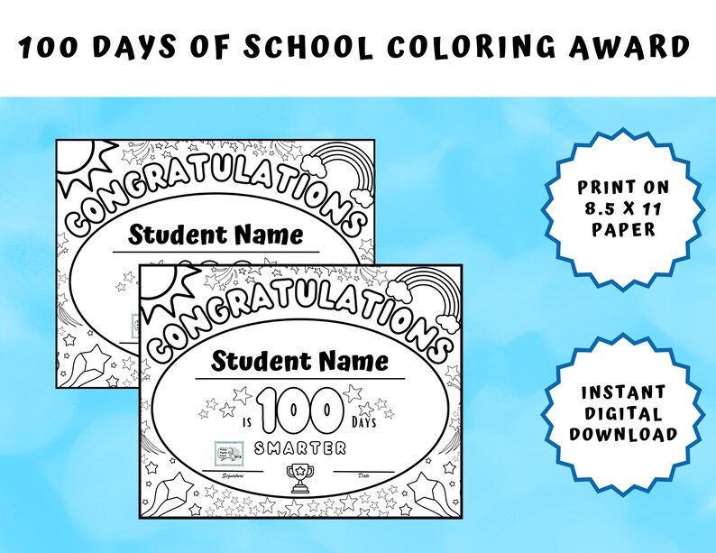 100th Day of School Certificate Award Printable template Activities