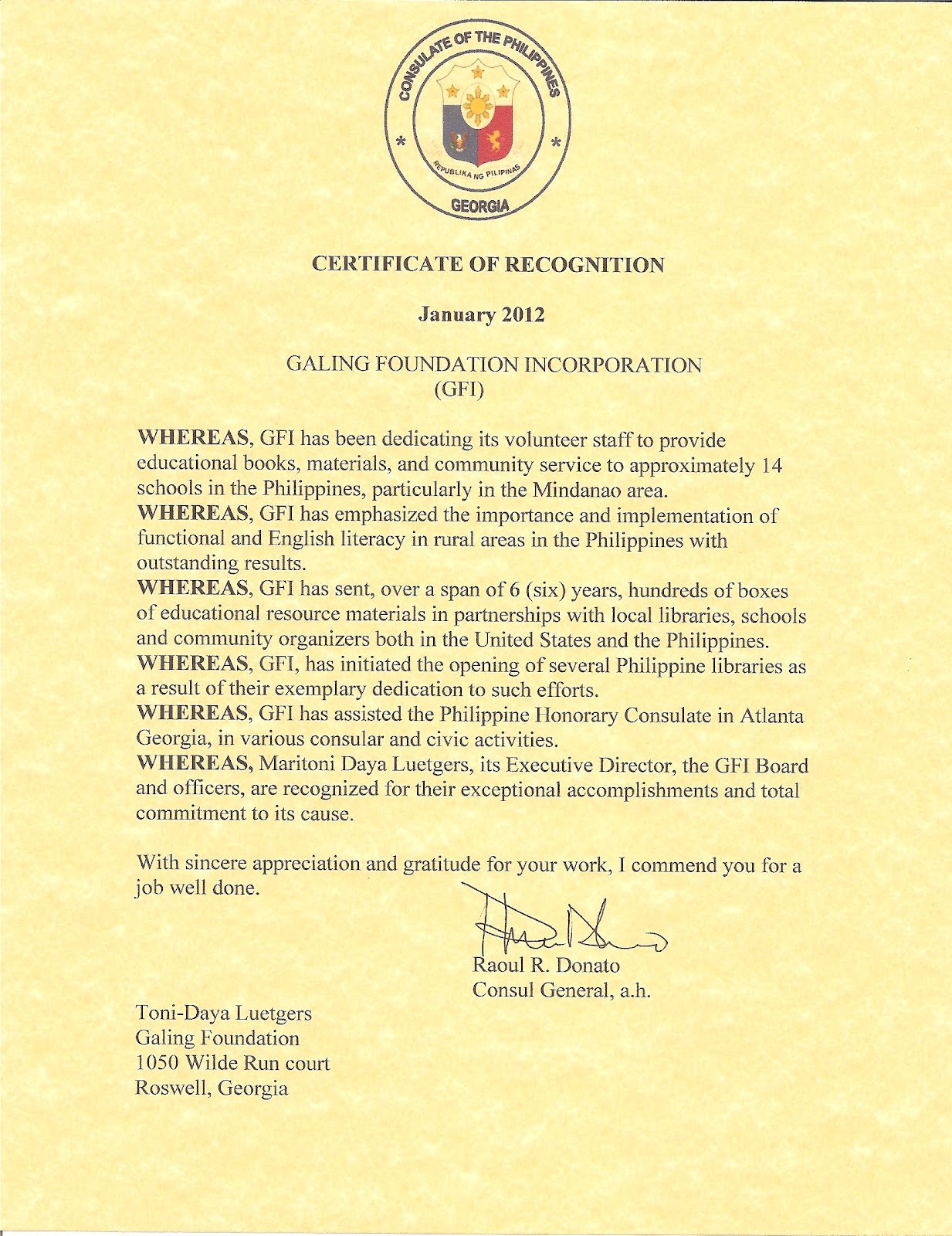 Galing (Great) News: Certificate of Recognition from the Philippine