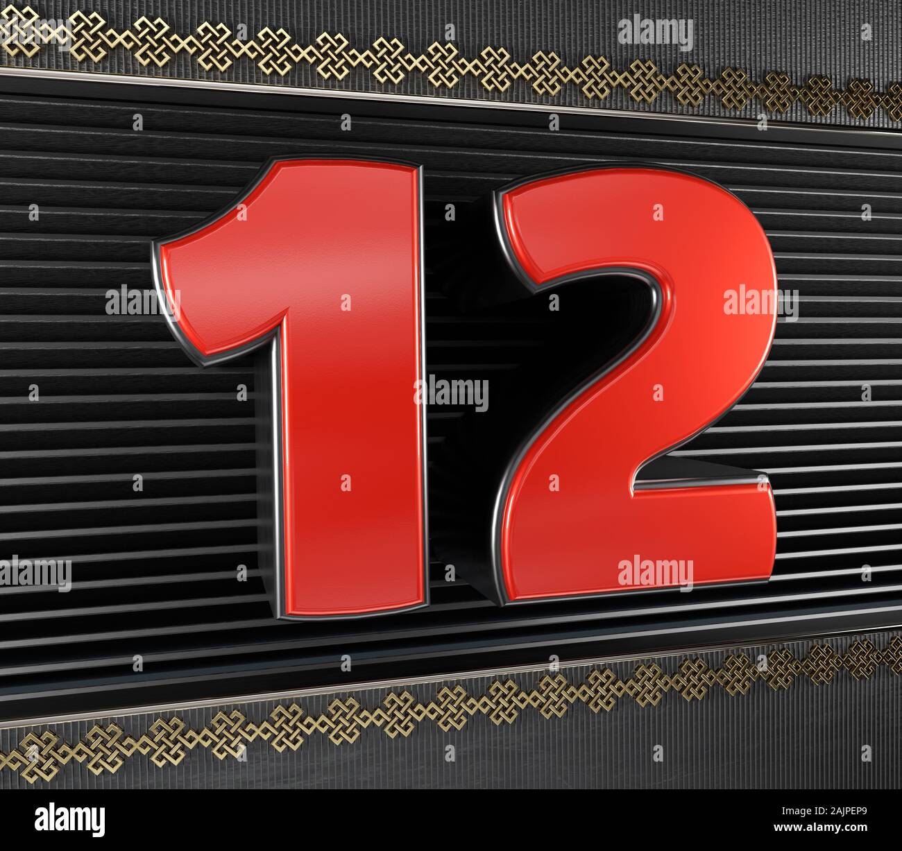 Red number 12 (number twelve) with golden symbols endless knot 3D