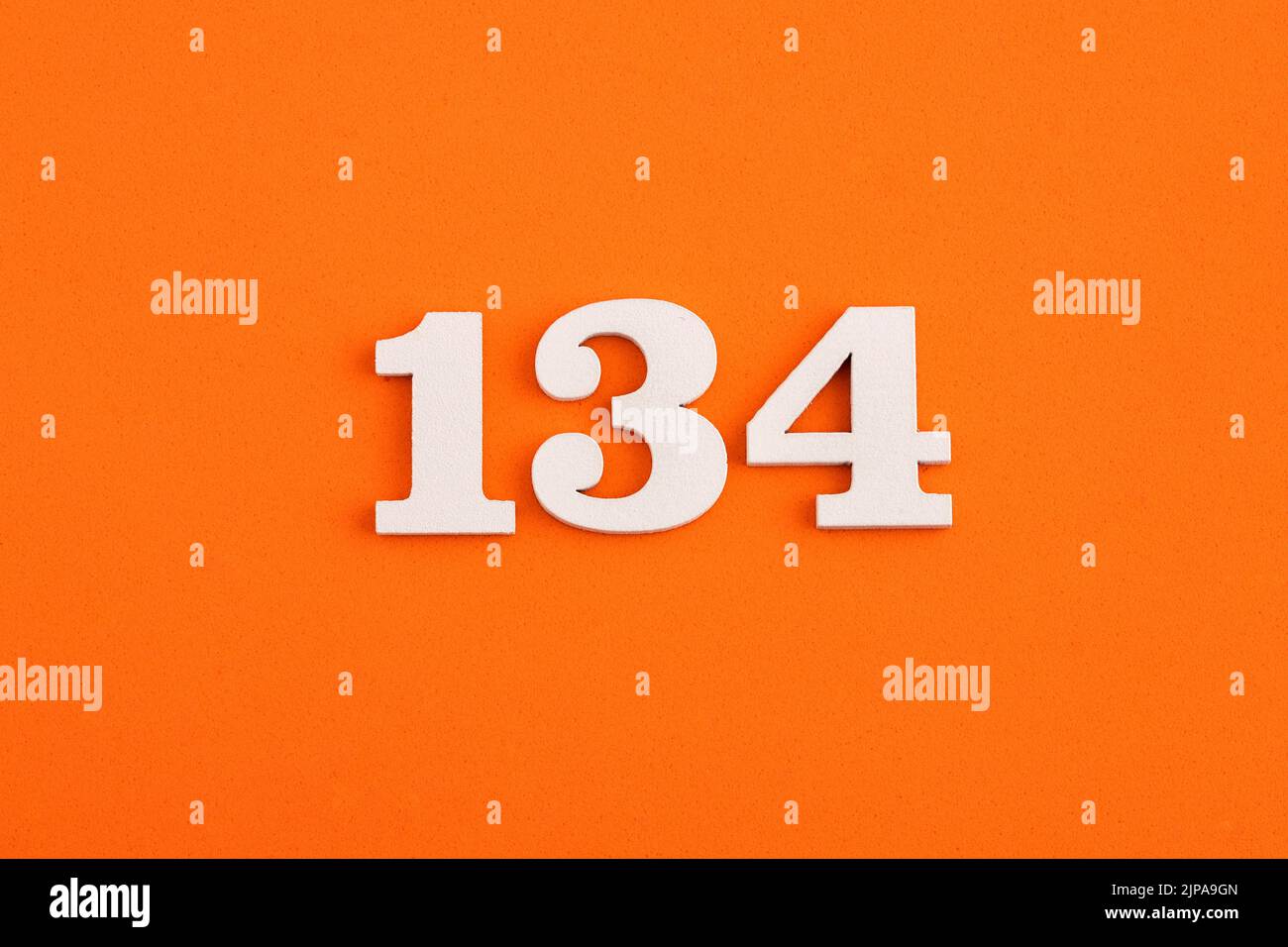 White wooden number 134 on eva rubber orange background Stock Photo Alamy