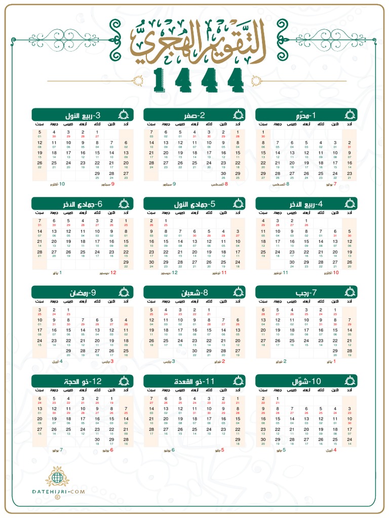 Hijri calendar for the year 1444 Hijri Gregorian calendar