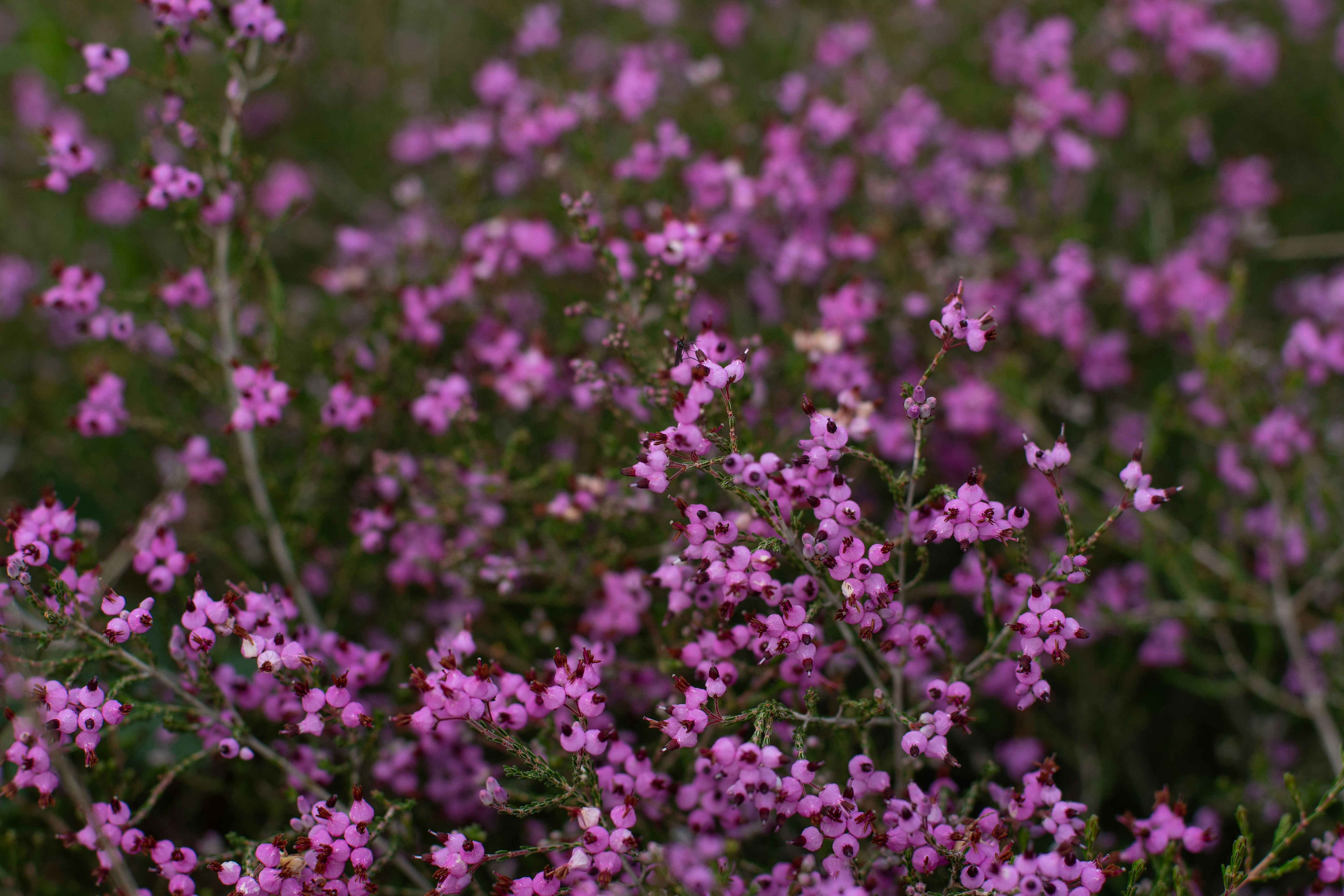 Un ramo de pequeñas flores moradas en un campo foto Imagen de Erica