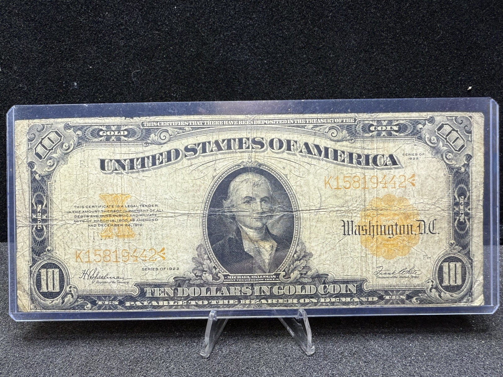 1922 $10 DOLLAR BILL GOLD CERTIFICATE COIN NOTE LARGE CURRENCY MONEY