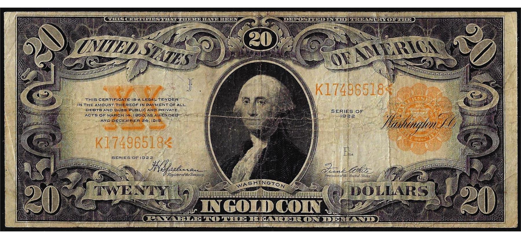 1922 $20 Large Size Gold Certificate Historical Note Payable in Gold