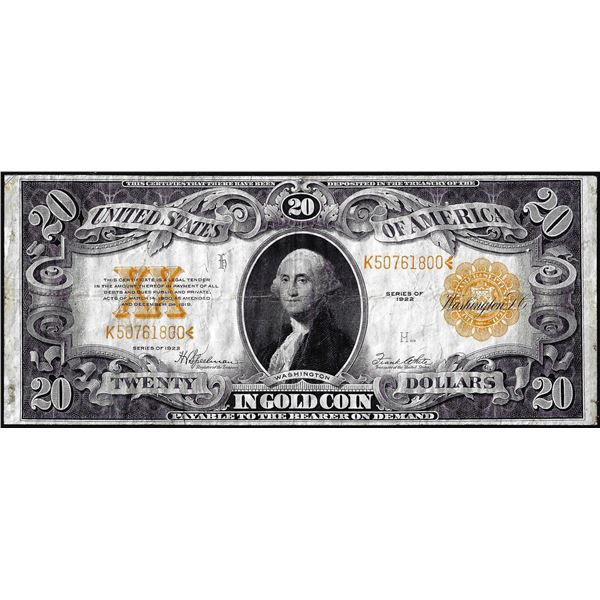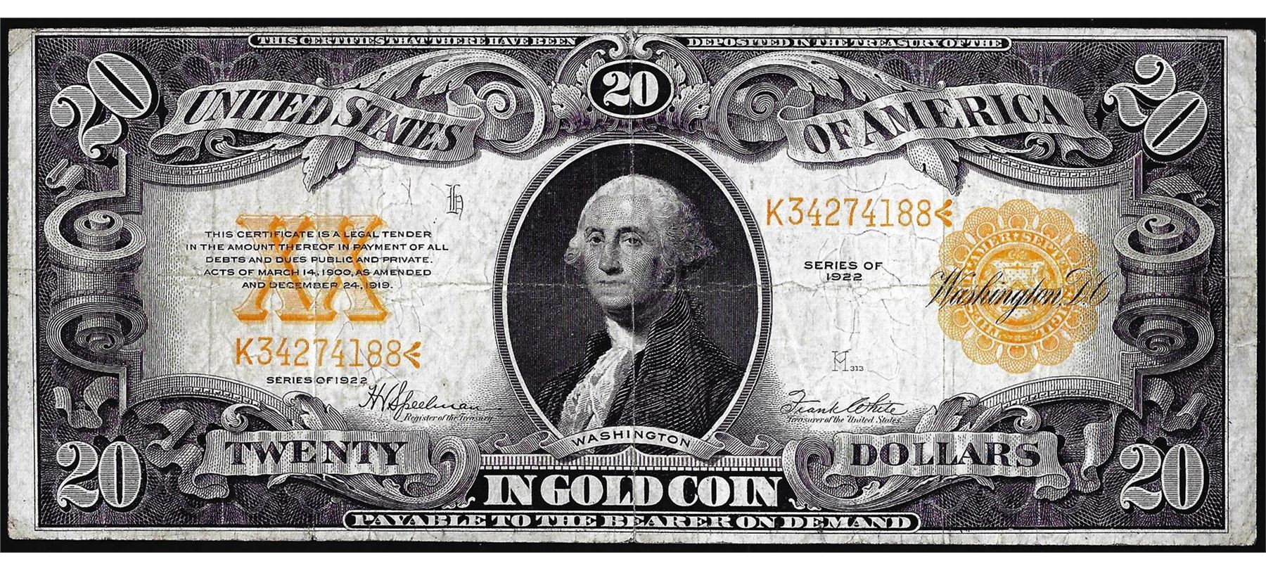 1922 United States $20 Twenty Dollar Gold Certificate Banknote