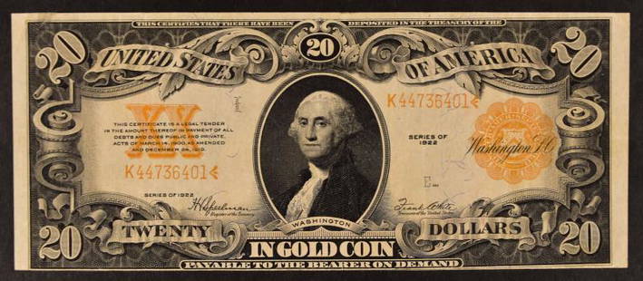 Sold at Auction: SERIES 1922 $20 GOLD CERTIFICATE