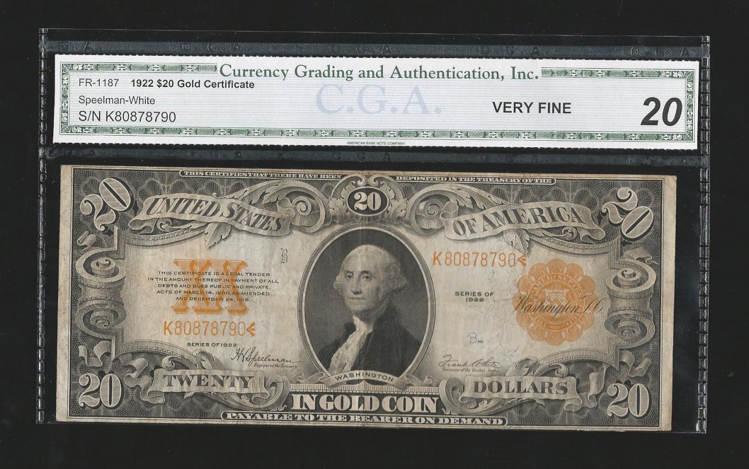 $20 1922 GOLD certificate CGA VF 20 = K80878790