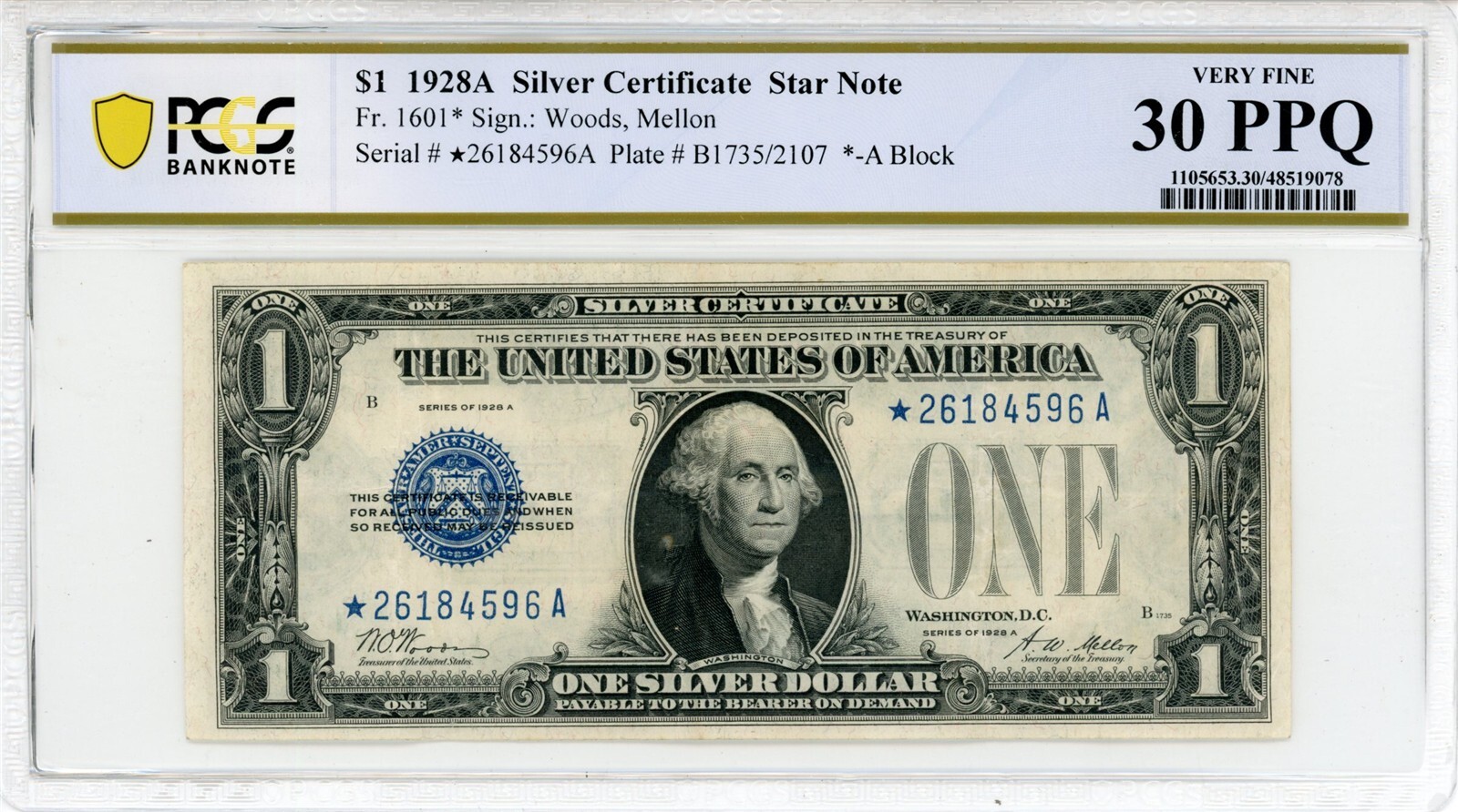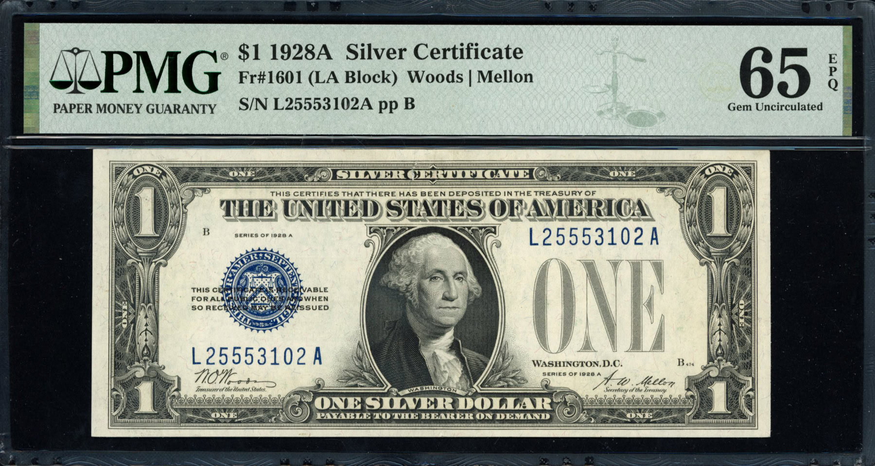 1928A PMG graded US silver certificate 1 dollar bill Woods/Mellon