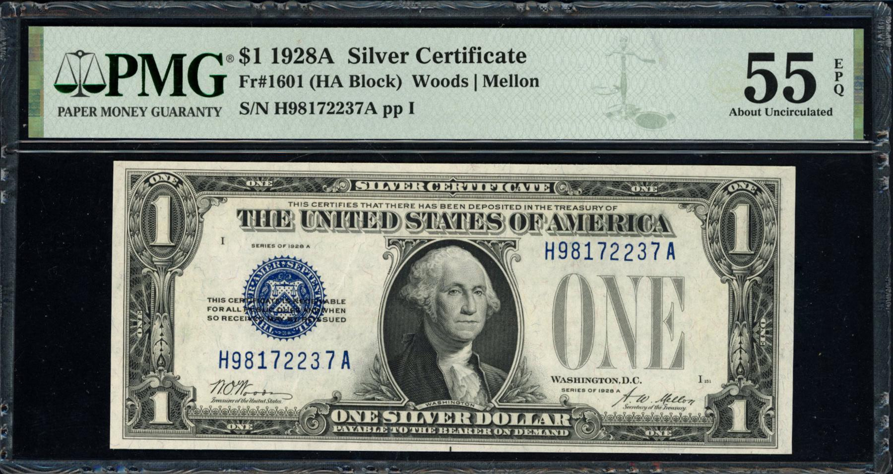 Fr 1601 (HA Block) 1928A $1 Silver Certificate Note Woods / Mellon PMG