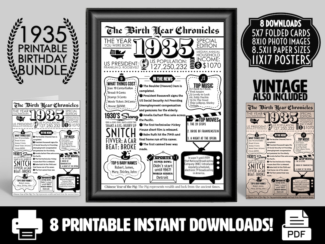 1935 PRINTABLE Vintage Newspaper Year You Were Born Birthday Bundle