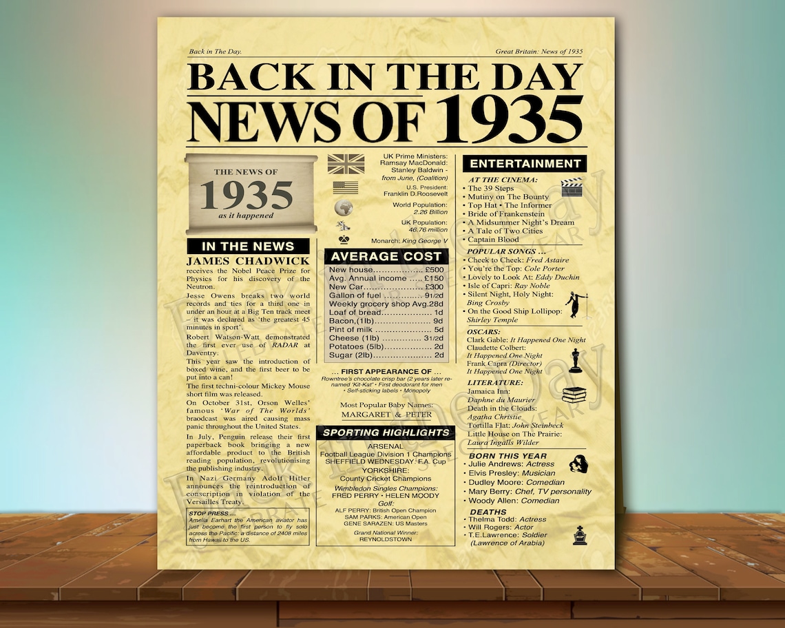 Back in 1935 PRINTABLE Newspaper Poster 1935 DIGITAL Birthday Sign Year