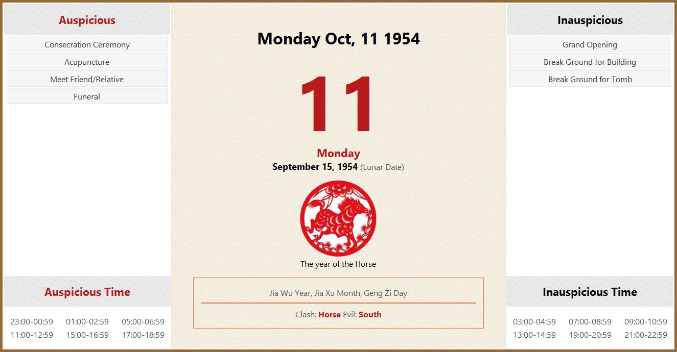 October 11 1954 Almanac Calendar: Auspicious/Inauspicious Events and