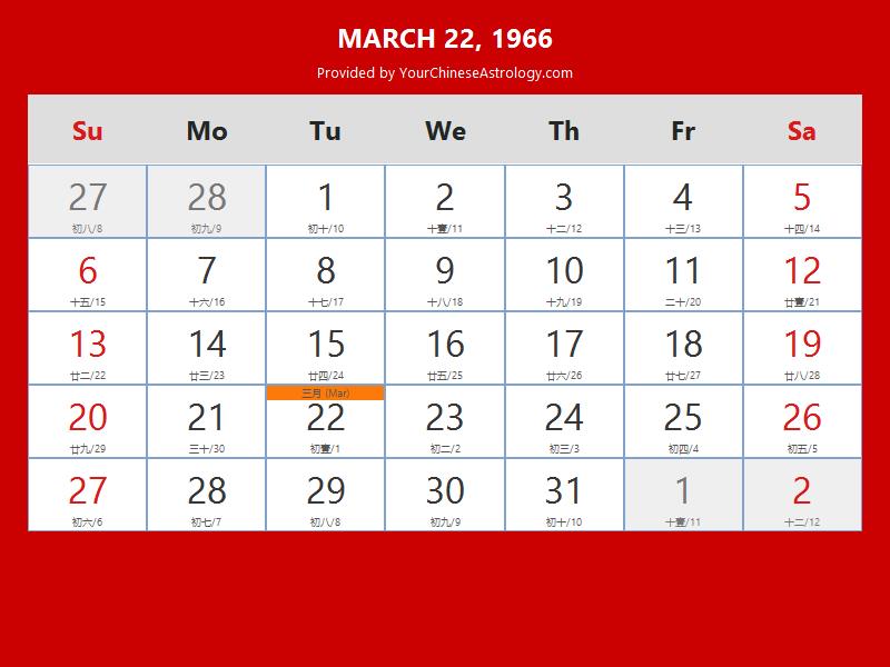 Chinese Calendar Mar 22 1966: Auspicious Things to Do and Hours Bazi
