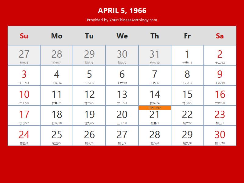 Chinese Calendar Apr 05 1966: Auspicious Things to Do and Hours Bazi