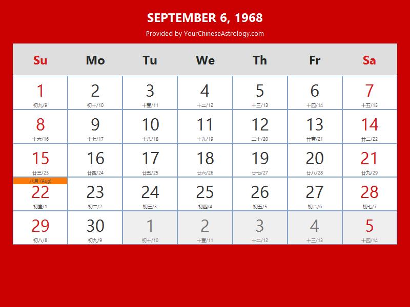 Chinese Calendar Sep 06 1968: Auspicious Things to Do and Hours Bazi