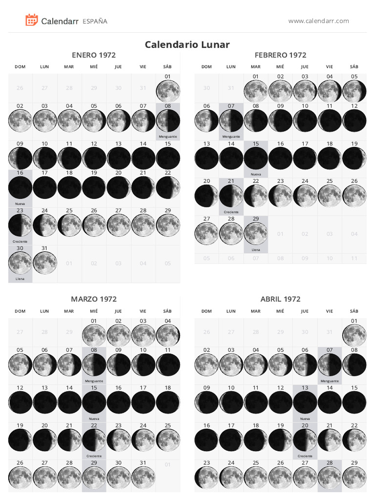 1972 Moon Phases: Lunar Phases Calendar for 1972