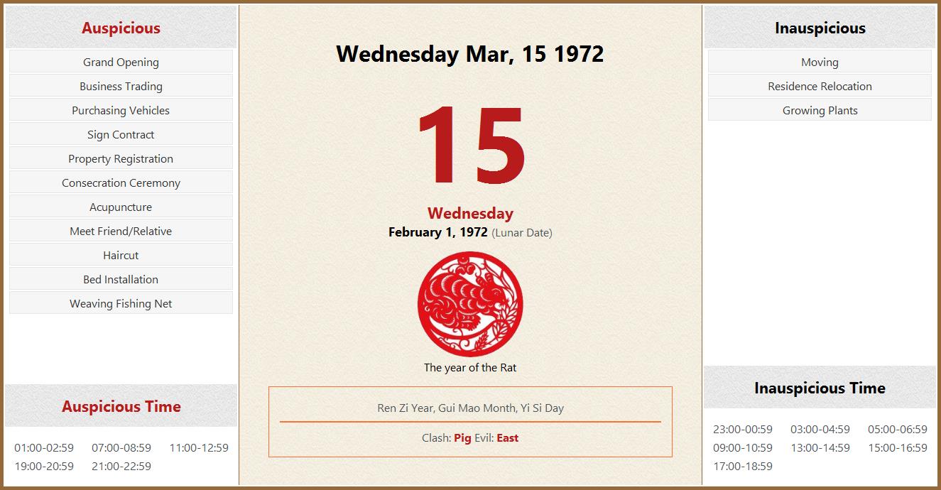March 15 1972 Almanac Calendar: Auspicious/Inauspicious Events and