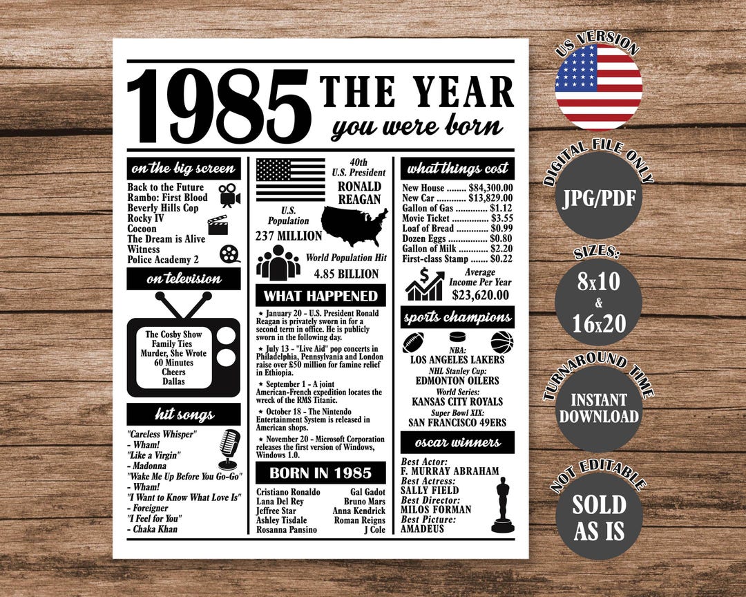 1985 Newspaper Poster Birthday Poster Printable Time Capsule 1985 T