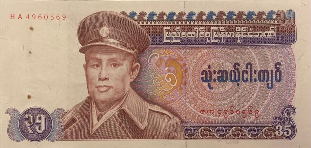 Myanmar Burma 35 Kyats (1986) vorne General Auang Sun II (3 Nadellöcher