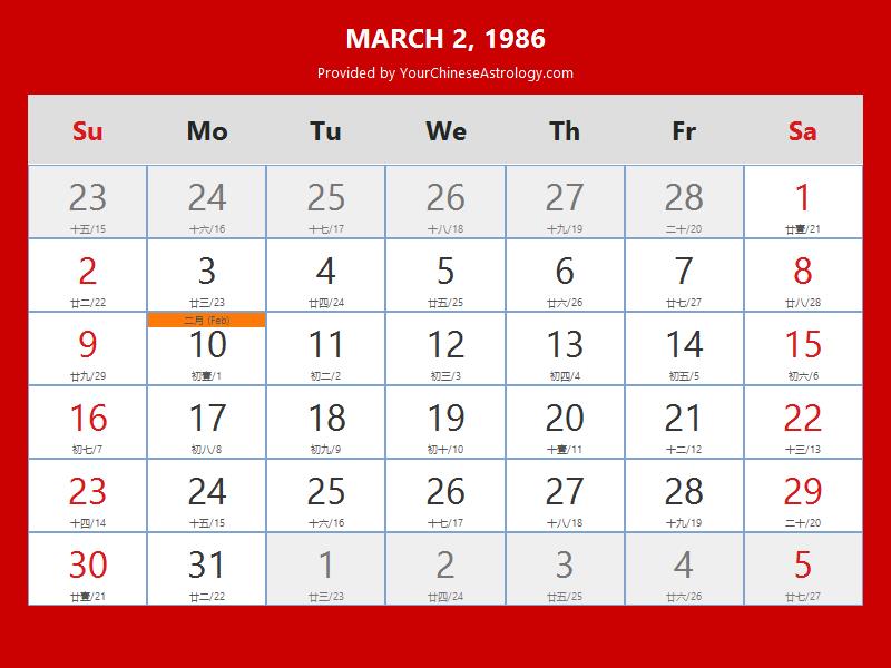Chinese Calendar Mar 02 1986: Auspicious Things to Do and Hours Bazi
