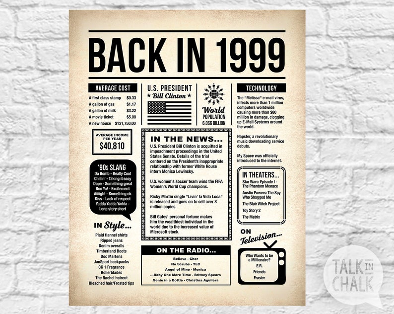 Back In 1999 Newspaper Style DIGITAL Poster 1999 Birthday Etsy