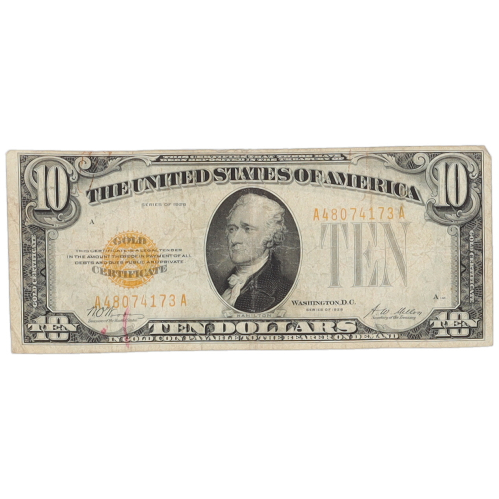Series of 1928 Ten10 Dollar Gold Certificate in Better Grade Condition