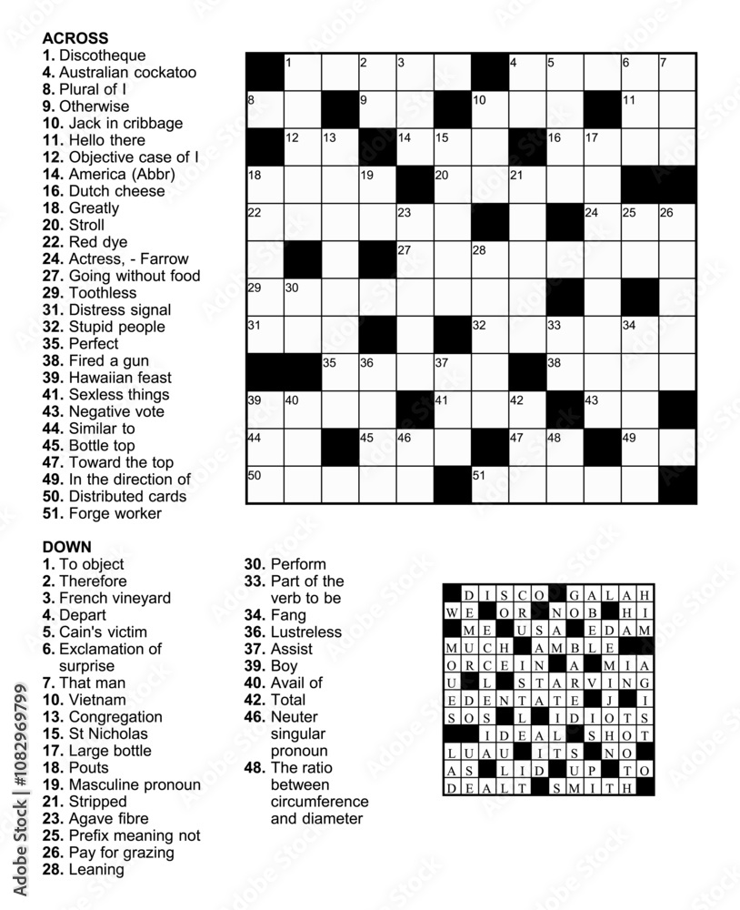 Crossword puzzle game with 12 x 12 squares with clues and solution