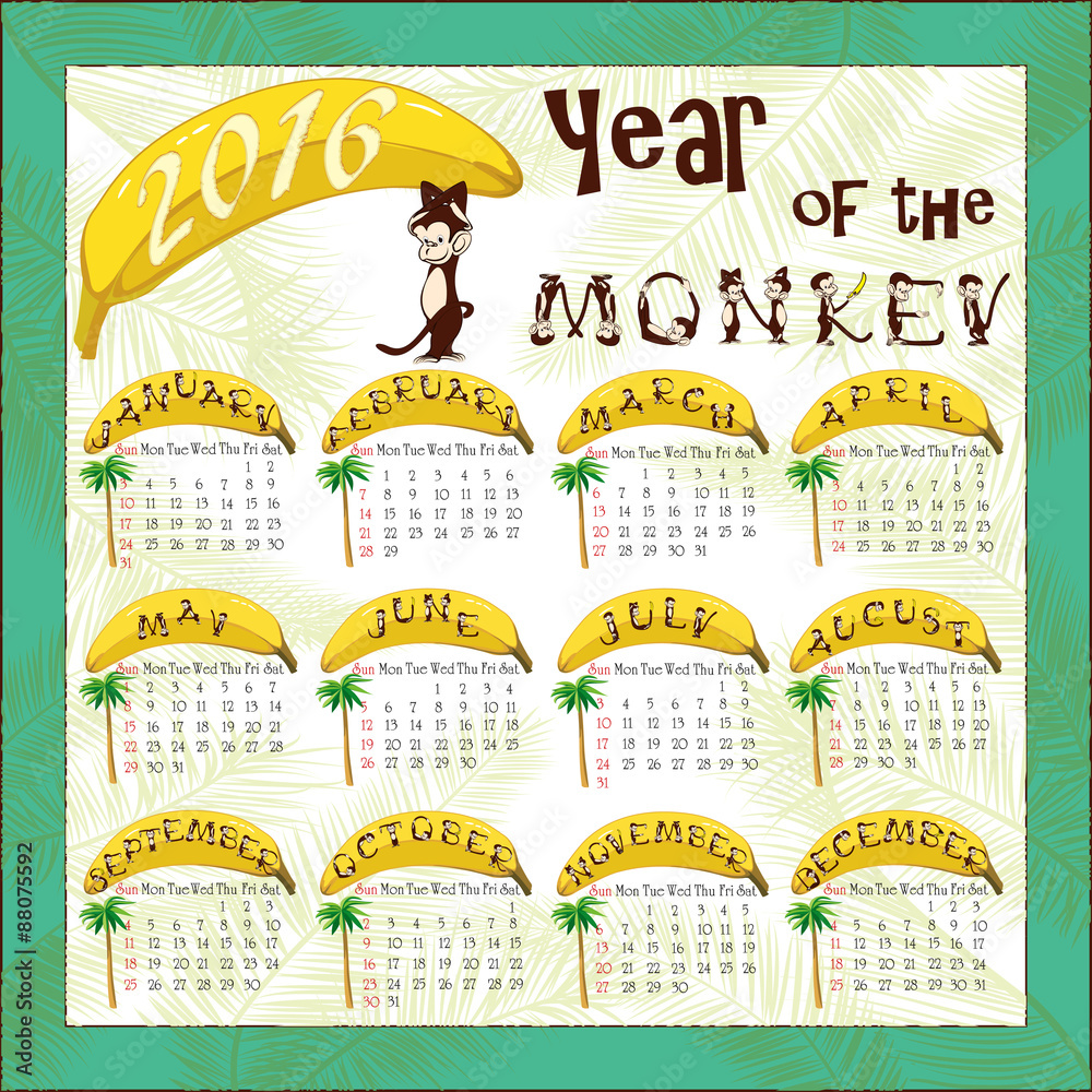 Calendar for 2016 with a symbol of the Chinese horoscope a monkey