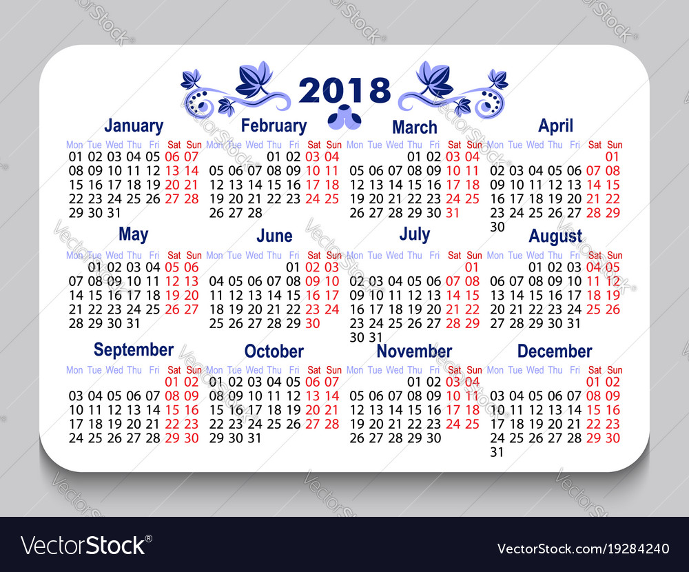 Colorful Calendar for Year 2018 in English Week starts on Monday
