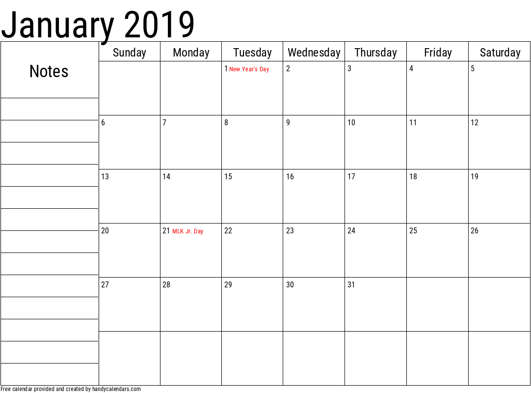 January 2019 Calendar With Notes And Holidays Handy Calendars