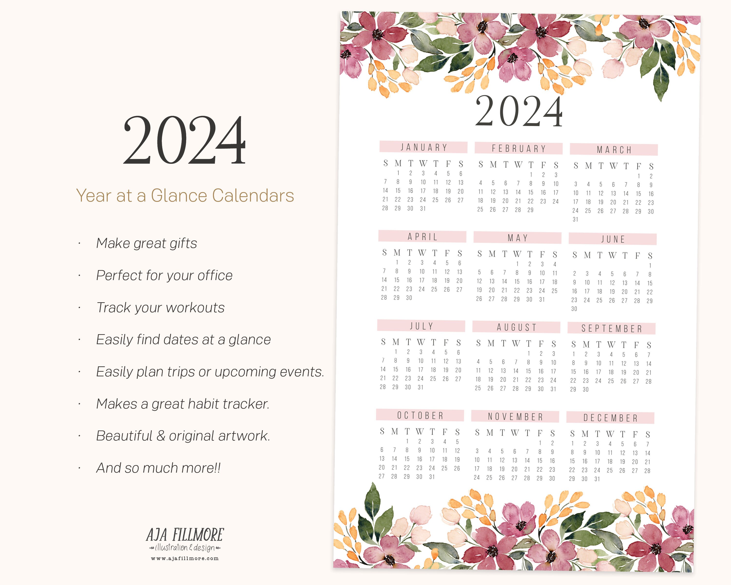 2024 Year at a Glance Calendar 2024 Wall Calendar 2024 Digital Wall