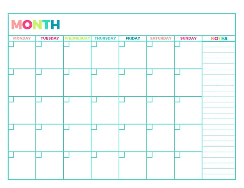 Bright Undated Monthly Planner Printable Month on 1 Page letter Size