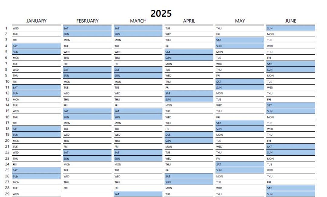 2025 Calendar One Page Minimalist Blue Weekend Highlights Etsy
