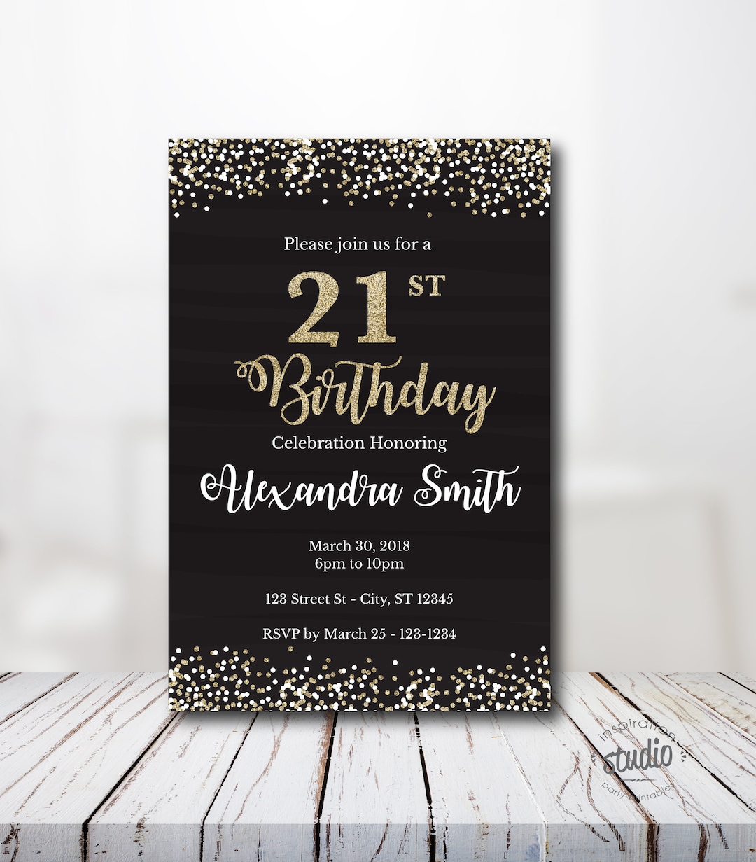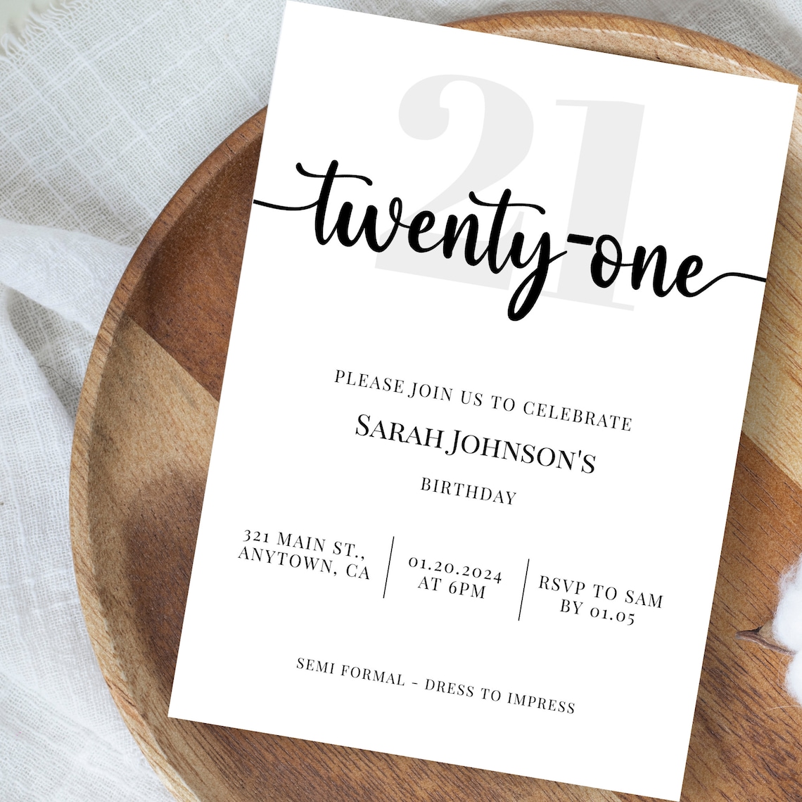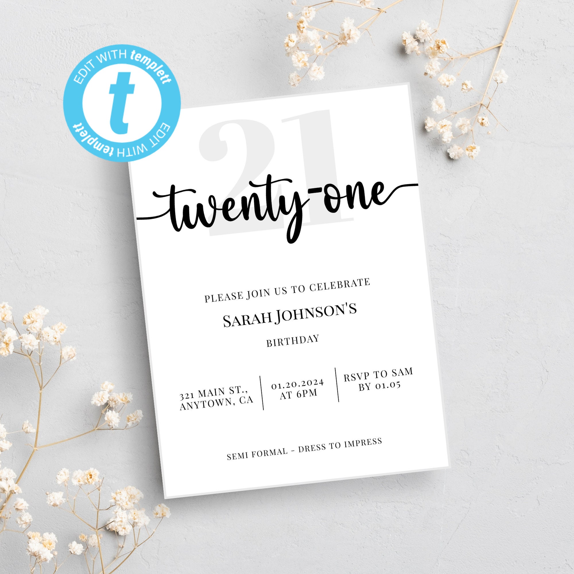 Printable 21st Birthday Party Invitation Customizable Template Elegant