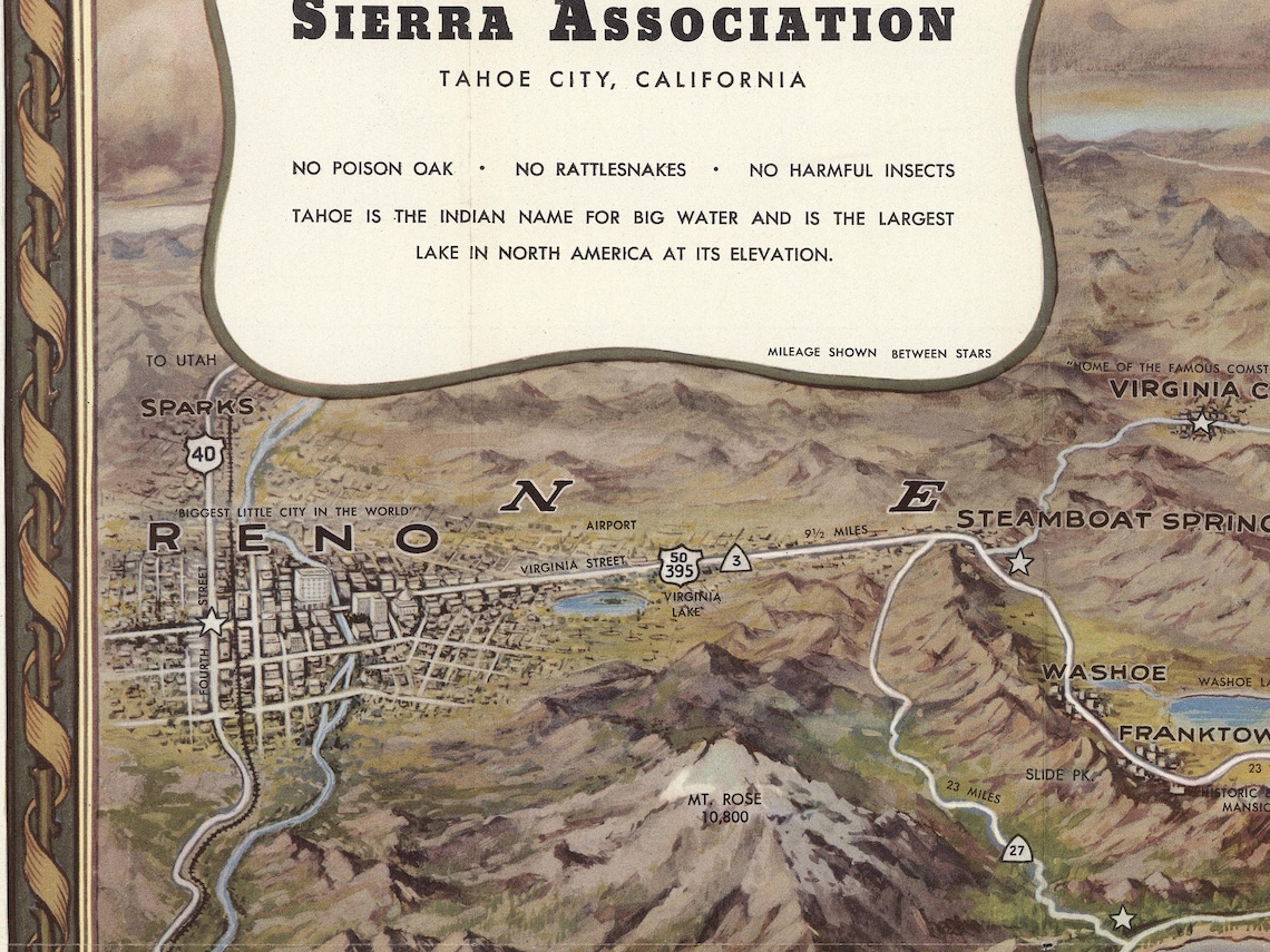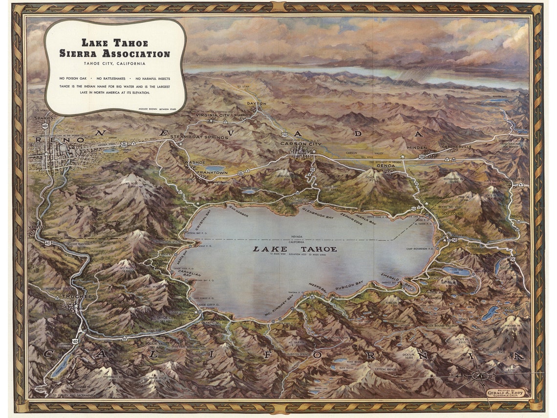 Karte von Lake Tahoe und Umgebung Vintage 1945 Berge Nevada California