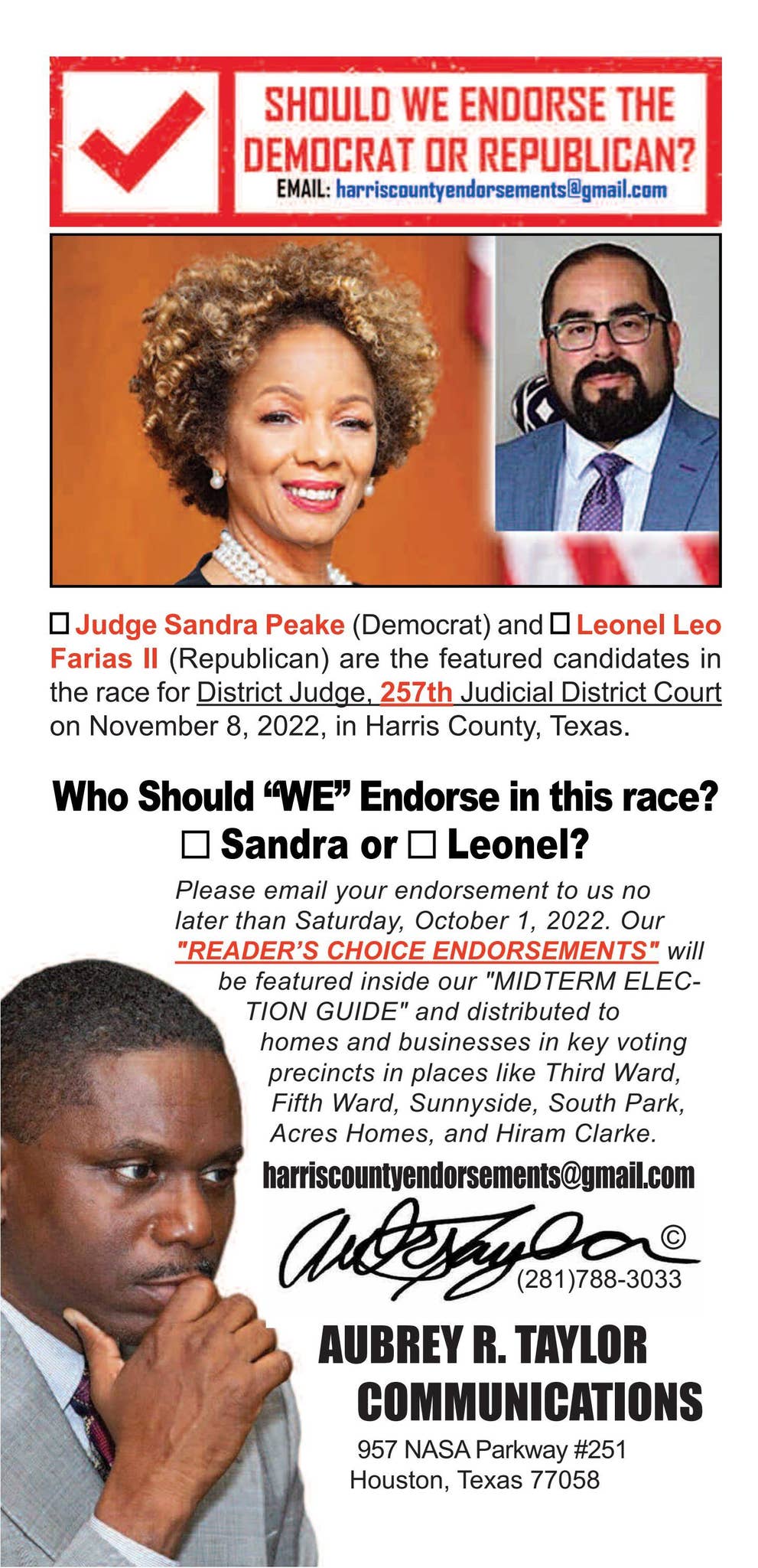 Judge Sandra Peake and Judge Leonel Farias are running for District