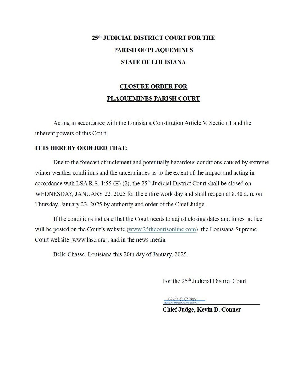 COURT CLOSURE NOTICE WEDNESDAY JANUARY 22 2025 25th Judicial